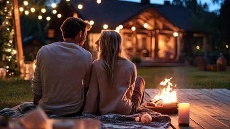 A serene evening scene featuring a couple enjoying each other's company by a crackling campfire, surrounded by warm lights and a cozy atmosphere.