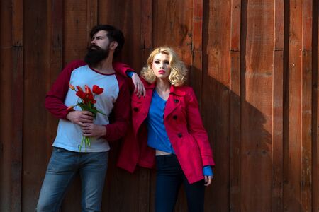 Portrait of fashion couple. Young couple in love outdoor on old wooden texture background. Love, romance and people concept.