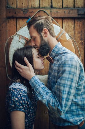 portrair man affectionately kissing woman on wooden wall backgro