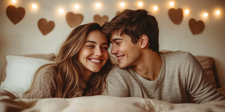 A young couple smiles affectionately while cuddling in a warm, inviting bedroom.