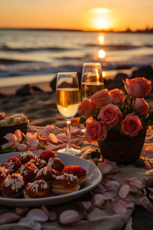 Sunset beach picnic for Valentine's Day, ocean view, blanket with rose petals, basket of gourmet treats, champagne, soft golden hour light
