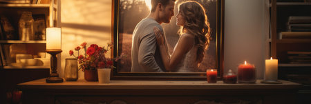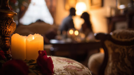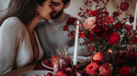 Two people share a special moment during their anniversary, surrounded by candlelight, roses, and a soft velvet table.