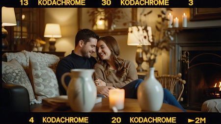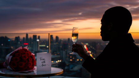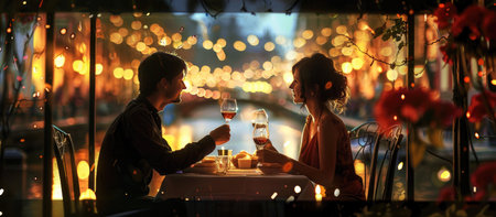 Two individuals enjoy a romantic evening together, seated side by side with wine glasses, creating an intimate atmosphere perfect for Valentine's Day.