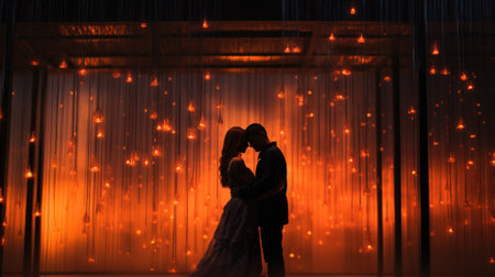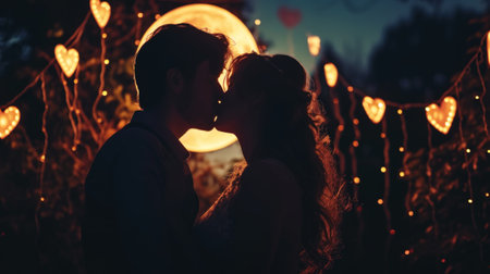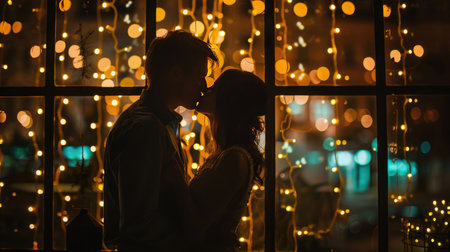 A young couple shares a romantic kiss at night, silhouetted against a backdrop of city lights and fireworks. This image evokes feelings of love and celebration. Ideal for Valentine's Day.