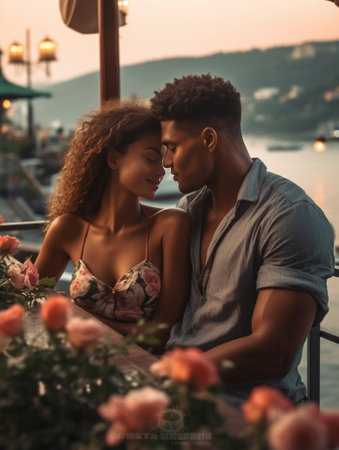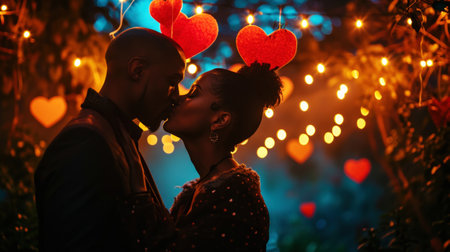 American African couple kissing against the background of bokeh of hearts. Romantic night. Love engagement concept. Generative AI.
