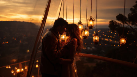 Romantic young couple in love embracing and kissing on a balcony at sunset with lanterns.