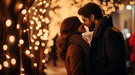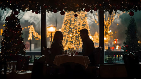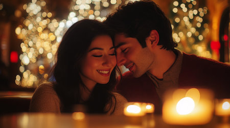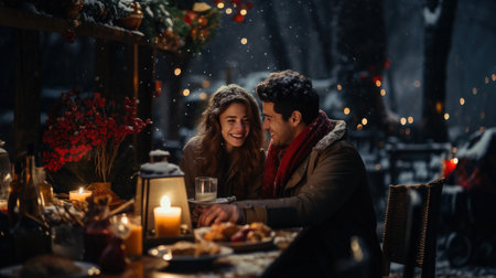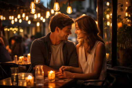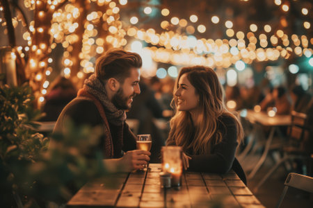 Couple enjoys a romantic evening at a cozy cafe adorned with twinkling lights