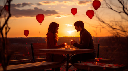 Romantic date in restaurant. Young romantic couple in love sitting at table with red heart-shaped balloons on background of sunset.