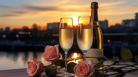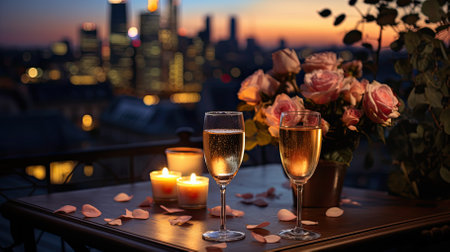 Champagne and rose. Two glasses of champagne on rooftop and cityscape view with twilight sunset time. Generative AI