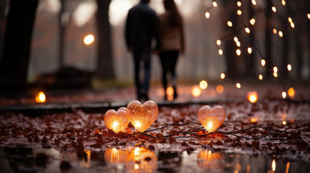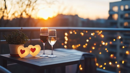 Two wine glasses and two glowing heart-shaped lights on a table, creating a romantic atmosphere for an evening celebration.