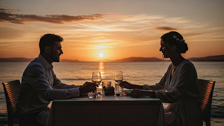 Two individuals sit at a table holding glasses of wine as the sun sets over the ocean. The scene is bathed in warm tones of orange and gold, suggesting a tranquil and intimate setting. The composition features silhouettes against the bright sky, creating a feeling of togetherness suitable for various commercial purposes.
