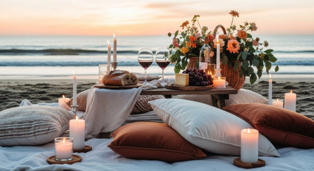 A charming beach picnic setup features candles, wine glasses, and a basket of flowers. The scene includes pillows and a blanket, creating an inviting atmosphere. Soft lighting and warm colors evoke a relaxing ambiance. Suitable for editorial and commercial use, this image could illustrate romance or lifestyle.