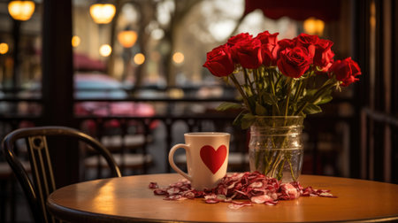 Romantic dinner in a restaurant with red roses and a cup of coffee