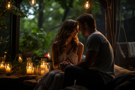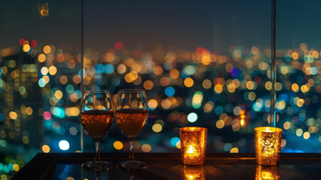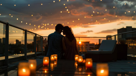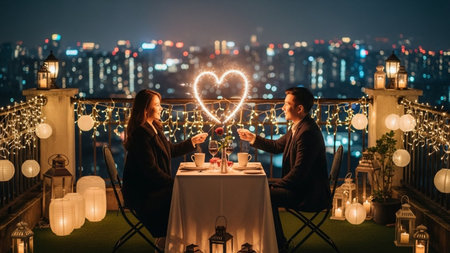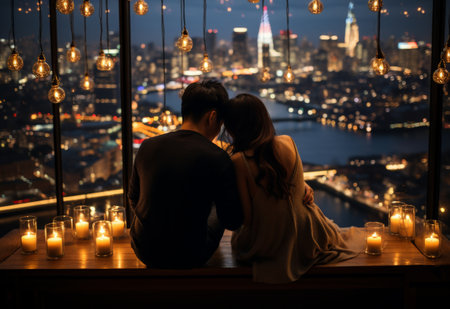 A couple is depicted enjoying a romantic dinner, illuminated by candlelight. The scene features a softly lit table set against a backdrop of twinkling city lights under a dark sky. This image evokes feelings of intimacy and celebration, suitable for various editorial and commercial applications.
