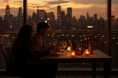 Couple sitting at the table in a restaurant in New York at sunset, A couple sharing a romantic dinner on a city rooftop overlooking the skyline, AI Generated