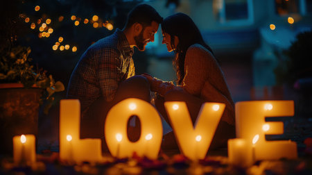 A candid photo of a man proposing to his partner, with LOVE spelled out in candles around them.