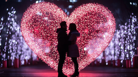 A couple enjoying a photography session in front of a sparkling heart-shaped light display for Valentine's Day.