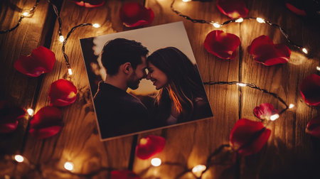 A romantic Valentine's Day card with a photo insert, surrounded by a frame of fairy lights and rose petals.