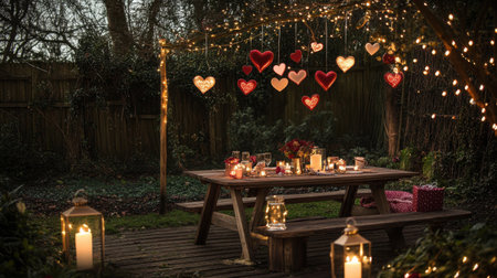 A romantic garden decorated with lanterns, hanging hearts, and a Valentine's Day picnic table setup.