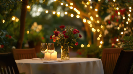 A Valentine's Day dinner setup in a garden with string lights, a white tablecloth, and a vase of fresh flowers.