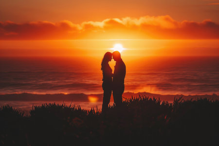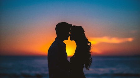 Two people lean in closely, their silhouettes contrasting with a stunning sunset over water, creating a romantic and serene atmosphere at dusk.