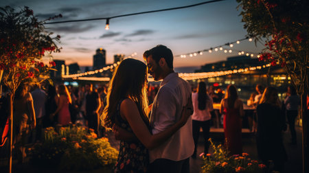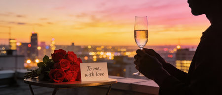 Romantic date on roof of tall building. Beautiful view of evening city. Concept of romance and love. AI Generated