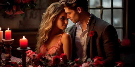 Romantic Asian couple enjoying a candlelit dinner with roses in a warm, intimate setting. Concept of Valentine's Day, love, romance, and passion. Cozy atmosphere with bokeh lights.