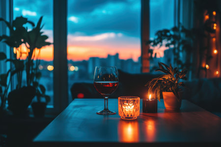 A glass of wine sits next to a candle on a table, creating a cozy ambiance,.