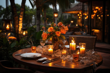 Romantic dinner in a tropical restaurant with orange flowers and candles.