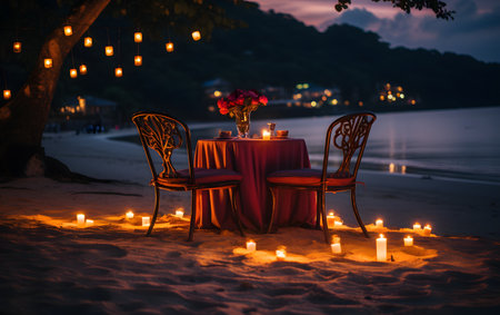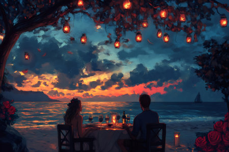 Romantic couple having dinner on the beach at sunset, with hanging lanterns, roses, and a sailboat in the distance