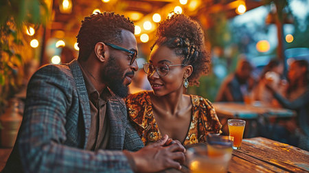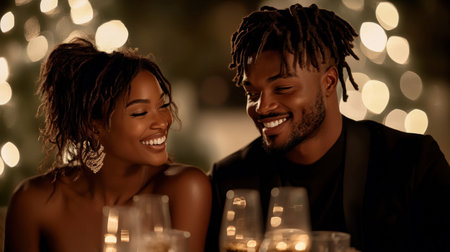 A joyful couple shares a warm moment at an evening gathering, surrounded by soft lights and a festive atmosphere, showcasing love and connection.