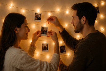 Young couple hanging instant photos on a wall decorated with fairy lights, creating a cozy and romantic atmosphere