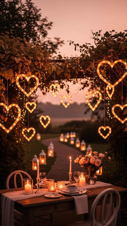 A beautifully set outdoor dinner table with candles, flowers, and heart-shaped lights hanging above, creating a warm and intimate ambiance for a special occasion at dusk.