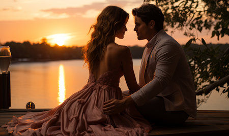 A man and a woman are seated on a wooden dock, watching the sunset over the water.