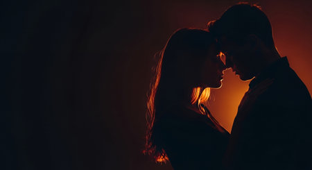 Silhouetted couple man and woman stands close in dramatic backlight, foreheads nearly touching. A moody, intimate moment of love, connection, and emotion captured in soft shadow and glow.