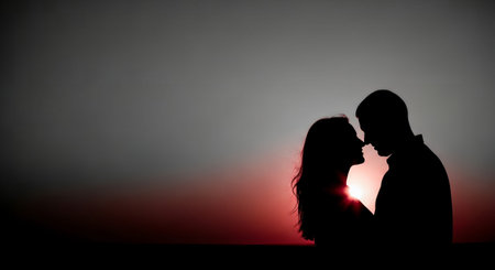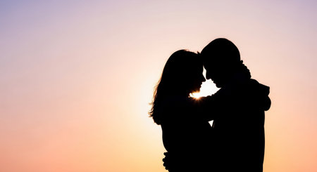 Romantic silhouette of a couple embracing against a vibrant sunset sky. Ideal for themes of love, connection, relationships, and nature's beauty.