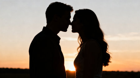 A couple getting ready to kiss each other by sunset background