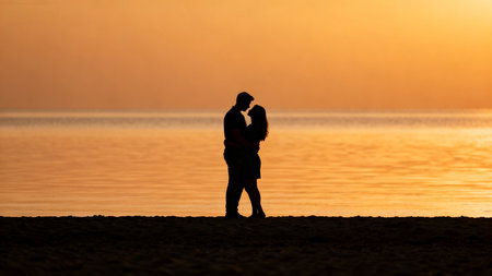 Couple is sharing a romantic moment on the beach, silhouetted against a beautiful sunset