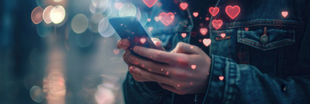 Hands holding smartphone with floating hearts and social media icons. Symbolizing online connections and digital relationships.