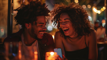 A vibrant lifestyle photograph capturing two friends laughing and enjoying a night out together at a cozy candlelit restaurant. The warm and joyful atmosphere emphasizes friendship and happiness.