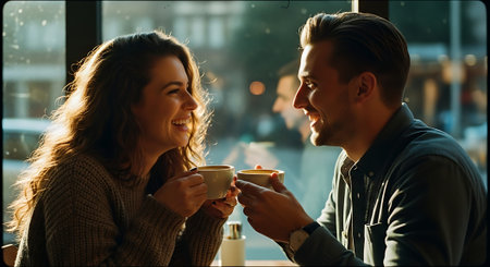 A young couple enjoying coffee and conversation at a cozy cafe