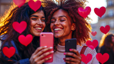 Two women smiling and taking selfies with their cell phones surrounded by red hearts