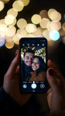 A man is holding a cell phone up to his face to take a picture of a woman. The woman is smiling and the man is looking at the camera. Concept of intimacy and connection between the two people