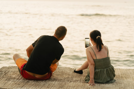 A couple in love, a young family photographing the sunset by the sea, sitting on the embankment back view, real moments on vacation lifestyle. High quality photo