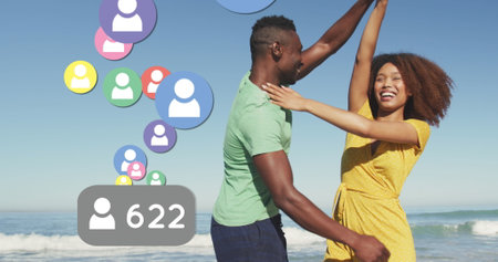 Profile icons with increasing numbers against african american couple dancing on the beach. social media networking and vacation concept