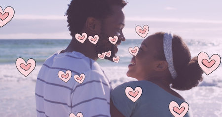 Image of heart icons over african american couple on beach. fashion and lifestyle concept digitally generated image.