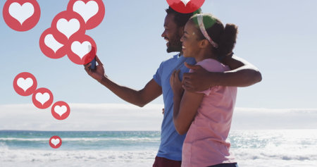 Image of social media heart icons over smiling couple taking selfie with smartphone on beach. digital interface, social media and global network concept digitally generated image.