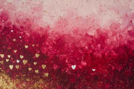 A festive Valentine's backdrop featuring glittering heart shapes in bold colors scattered across a radiant pink-to-red gradient.