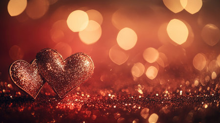 Two sparkling red hearts sit in the foreground, artistically highlighted by a warm, blurred bokeh background, perfect for romantic designs.