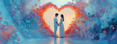 Couple Embraces in a Romantic Setting With Vibrant Colors and Heart-Shaped Artwork at Sunset
